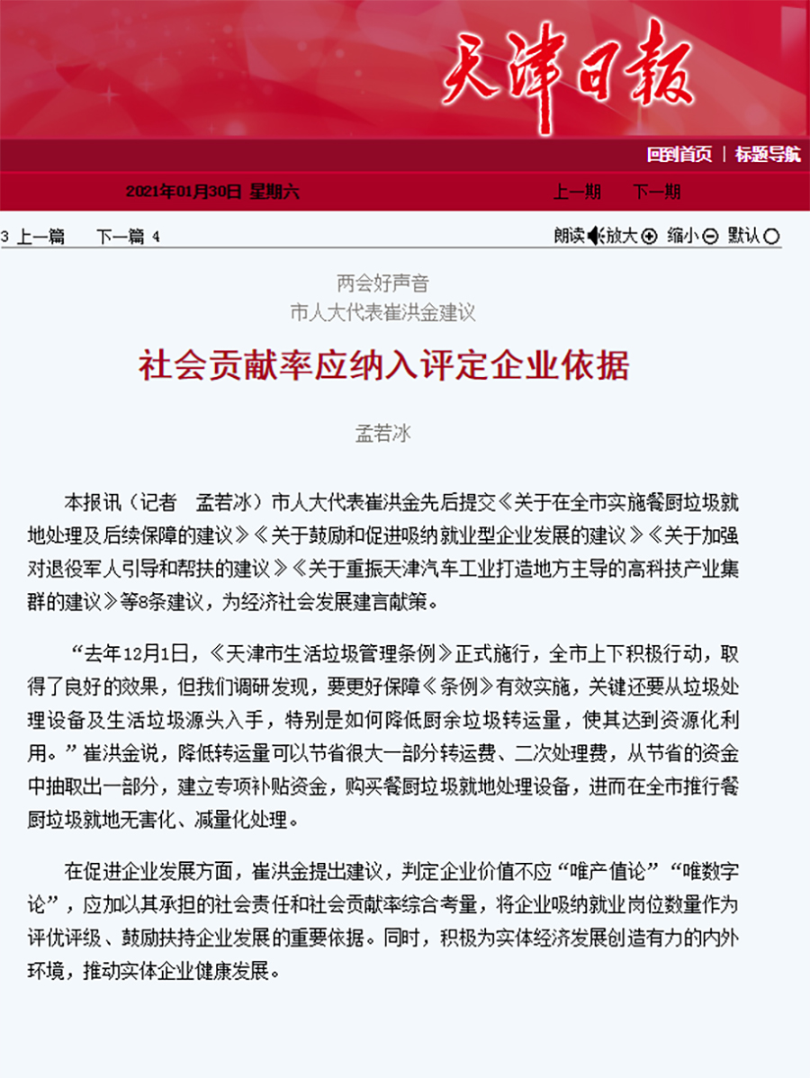 > 两会好声音 市人大代表崔洪金建议---社会贡献率应纳入评定企业依据